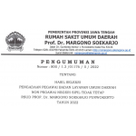 Sesuai dengan pengumuman Nomor 800/1.3/00630/I/2022 Tentang Hasil Seleksi Administrasi Dokumen Pendaftaran Pengadaan Pegawai Badan Layanan Umum Daerah Non Pegawai Negeri Sipil Tidak Tetap RSUD Prof. Dr. Margono Soekarjo Provinsi Jawa Tengah Tahun ...