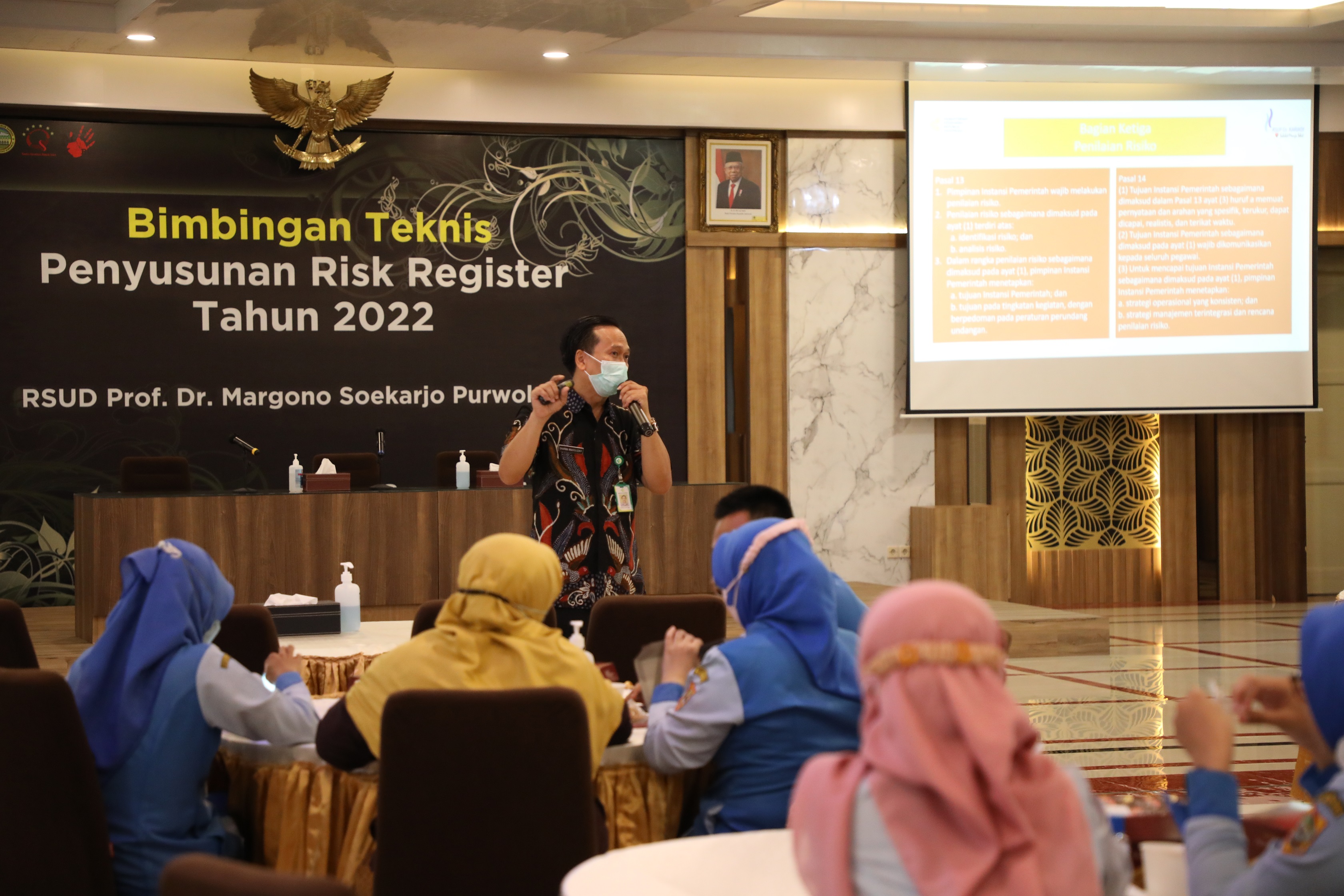 Kegiatan ini bertujuan agar setiap unit kerja mampu menyusun resiko klinis dan non klinis yang ada di unitnya masing-masing, kemudian menentukan resiko yang dapat diterima dan ditolak serta memprioritaskan resiko yang harus diselesaikan terlebih dahulu. Selama 2 hari kegiatan, para peserta mendapatkan meteri terkait manajemen risiko serta pendampingan pengisian form risk register. Selama kegiatan peserta akan dibagi menjadi beberapa kelompok dan setelah tersusun dilakukan presentasi oleh masing-masing kelompok.